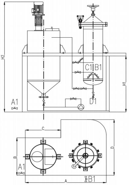 带混合缸的过滤机组及外形尺寸圈:A1: 进口 B1:出口 C1:取样 D1:排渣口