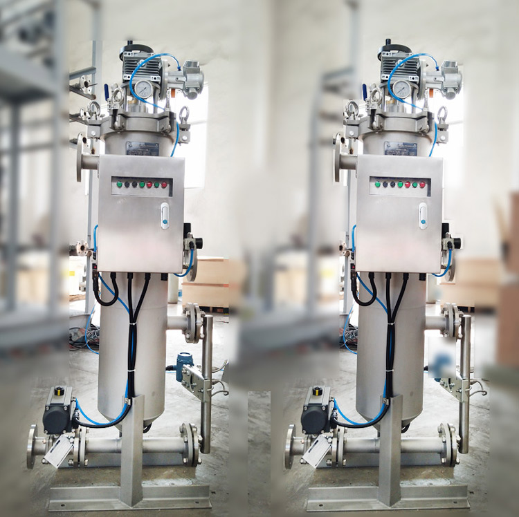 [过滤状态]液体从进口流入,带弹簧的圆盘形刮刀紧贴于滤元内表面,停于滤元上端,液体穿过刮刀,从滤元内表面向外流动,杂质被截留在内表面,液体从出口流出;随着时间的推移,杂质逐渐增多,压差上升,按设定压差或定时清洗滤元。[清洗状态]气缸驱动刮刀上下往复运动清洗滤元,刮刀向下运动时,杂质被刮刀推送到过滤器底部,大比重杂质沉淀到集污腔。刮刀向上运动时,残留杂质被刮除推送到滤元上端,杂质被流动液体冲走,透过刮刀,回到滤元内表面,刮刀向下运动时被刮走。每次清洗由数次冲程组成,滤元表面清洗后,恢复过滤能力。清洗时正常过滤,流量不中断。