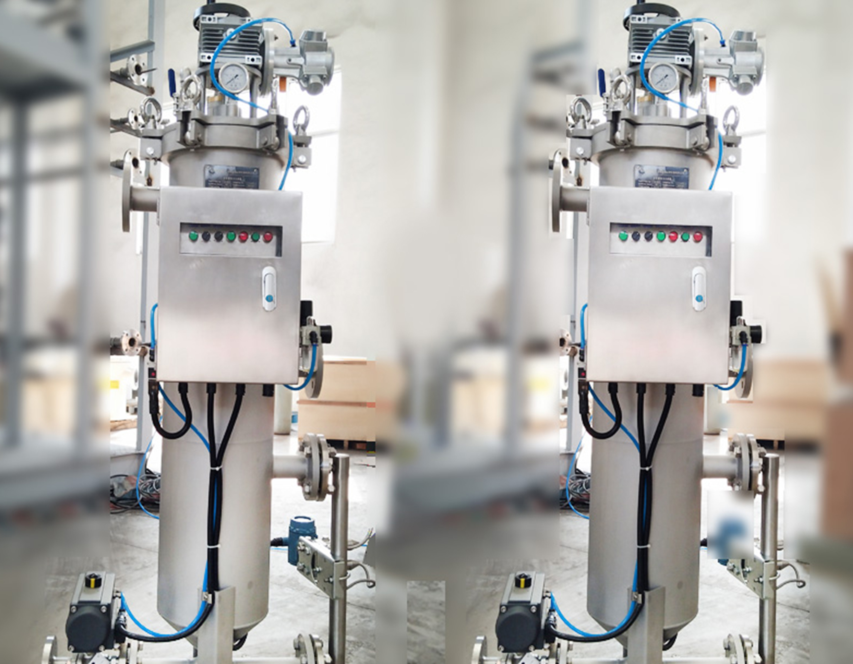 [过滤状态]液体从进口流入,带弹簧的圆盘形刮刀紧贴于滤元内表面,停于滤元上端,液体穿过刮刀,从滤元内表面向外流动,杂质被截留在内表面,液体从出口流出;随着时间的推移,杂质逐渐增多,压差上升,按设定压差或定时清洗滤元。[清洗状态]气缸驱动刮刀上下往复运动清洗滤元,刮刀向下运动时,杂质被刮刀推送到过滤器底部,大比重杂质沉淀到集污腔。刮刀向上运动时,残留杂质被刮除推送到滤元上端,杂质被流动液体冲走,透过刮刀,回到滤元内表面,刮刀向下运动时被刮走。每次清洗由数次冲程组成,滤元表面清洗后,恢复过滤能力。清洗时正常过滤,流量不中断。